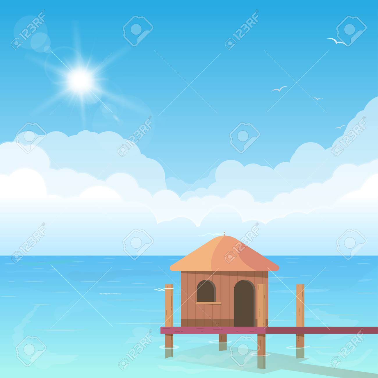 Beach Bungalow Standing In Water Ocean Shore Hotel Hut Wooden