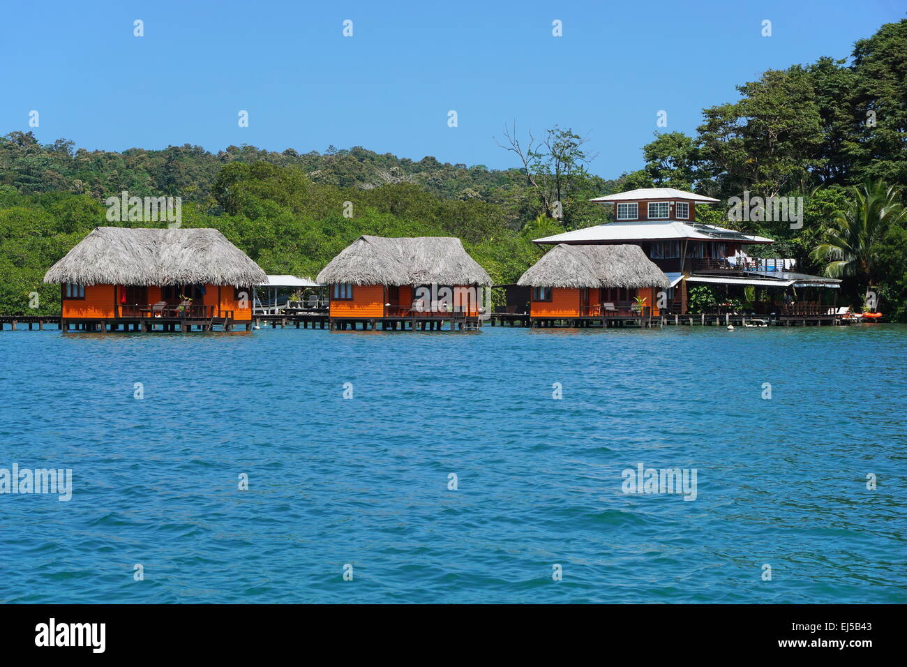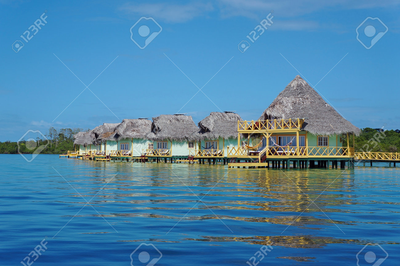 Bungalows Over Water With Thatched Roof Caribbean Sea Bocas